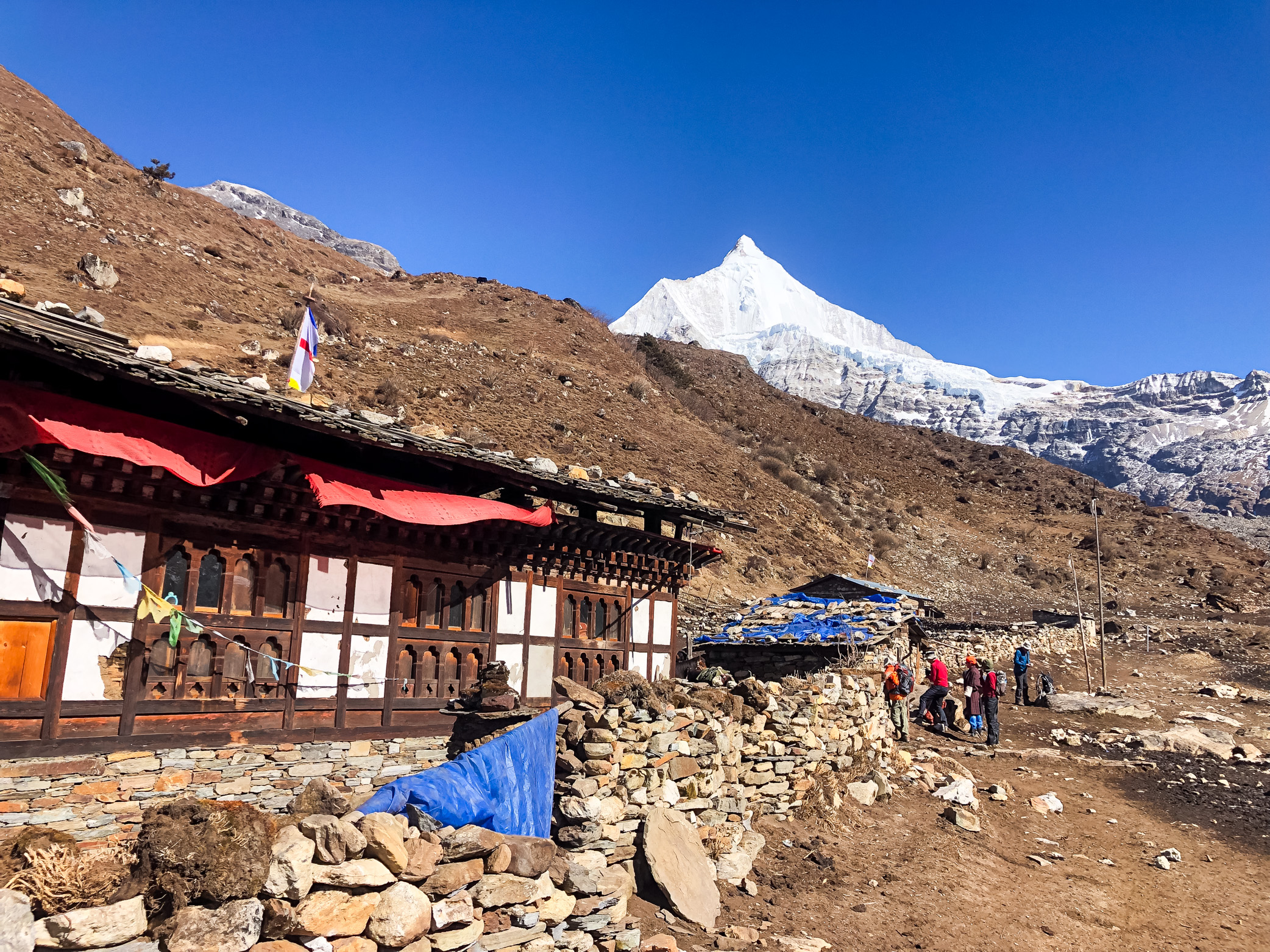 Wind whipped across the ridge while prayer flags snapped loudly in the air. Mountains stretched endlessly in every direction.