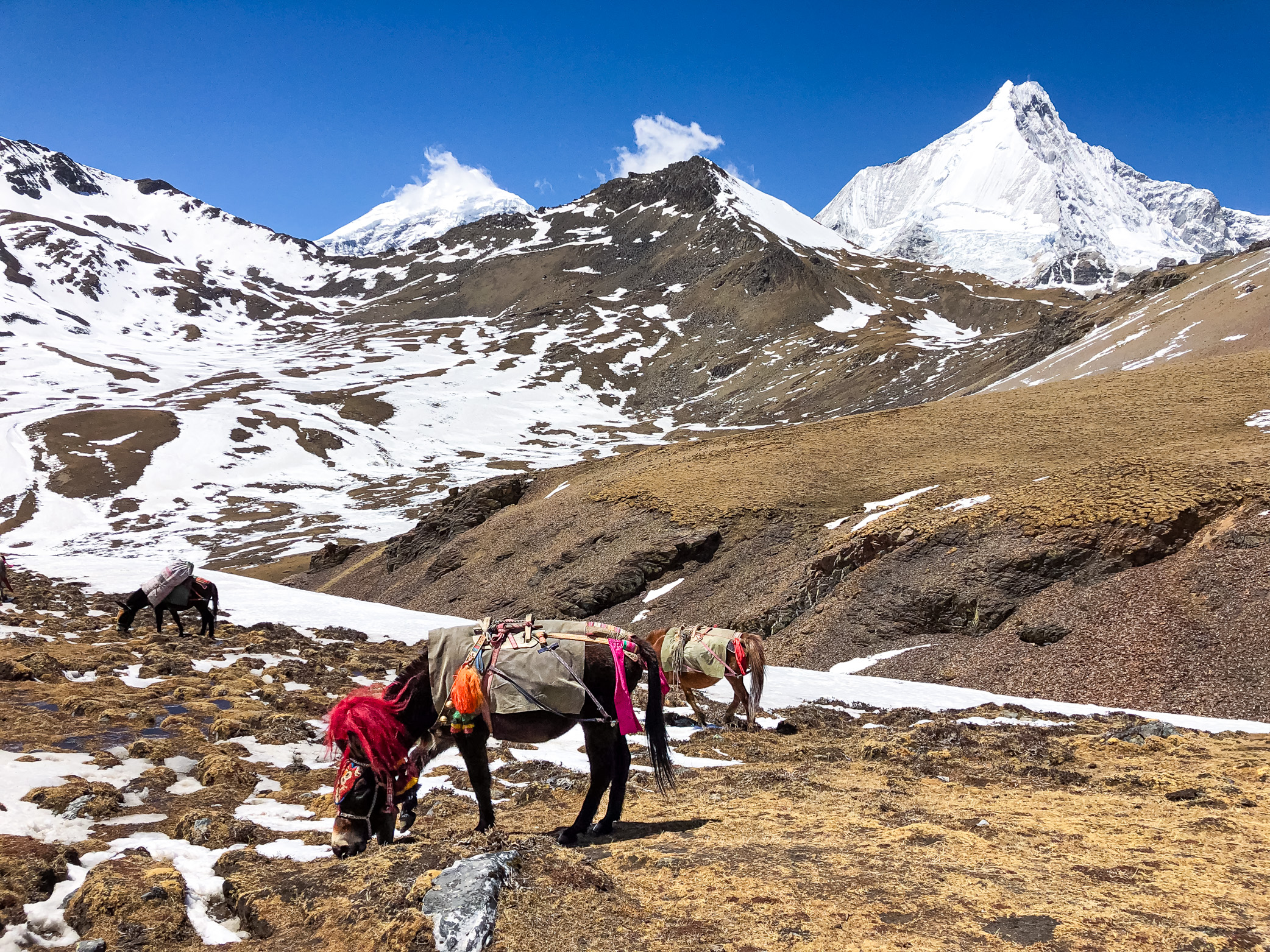 Snow patches covered sections of the path, and some of the pack animals struggled to navigate the deeper drifts.
