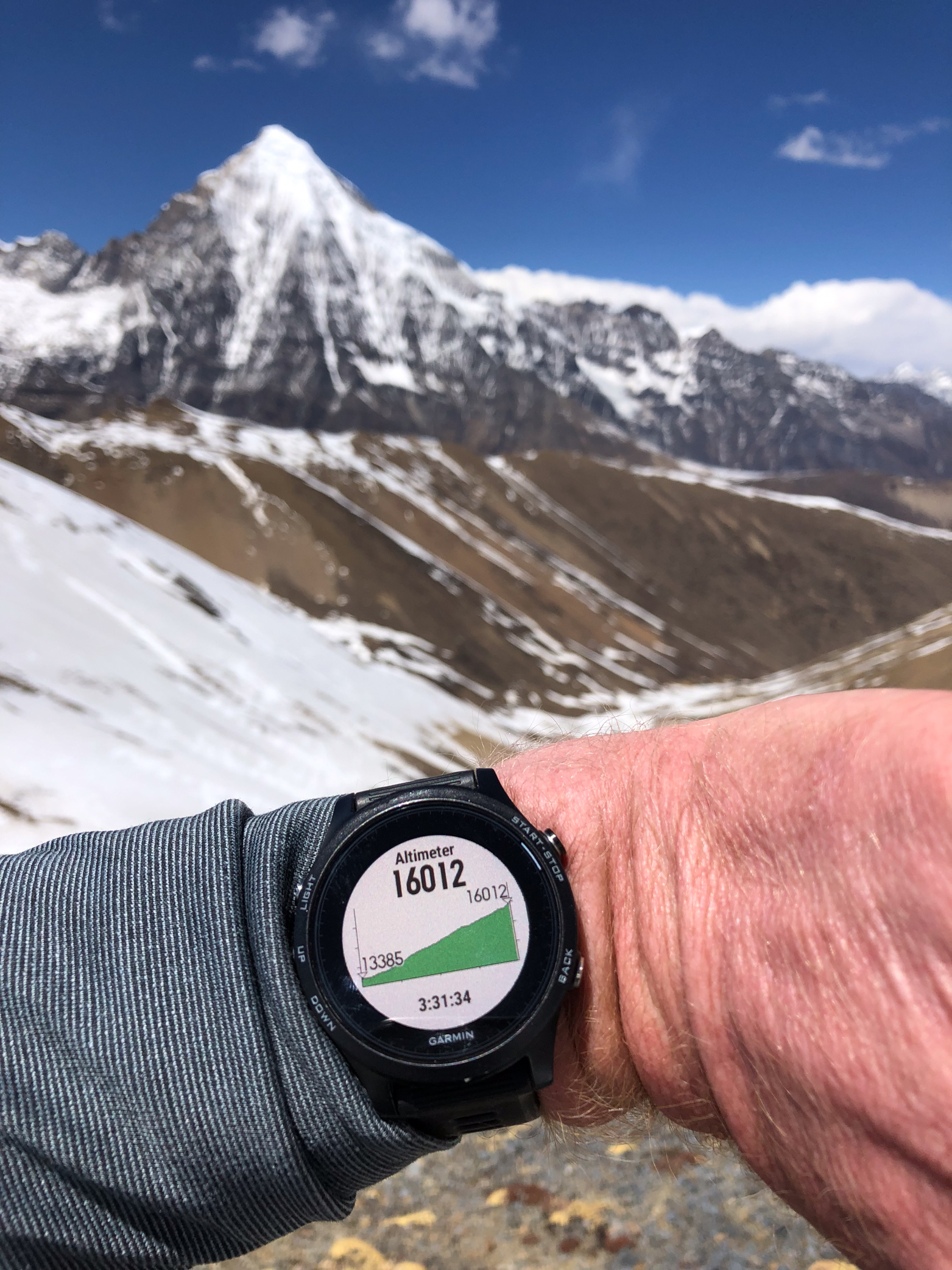 Shyam, who had never done much high-altitude trekking before, joined me at the top and we took a photo of him holding my watch showing the elevation.